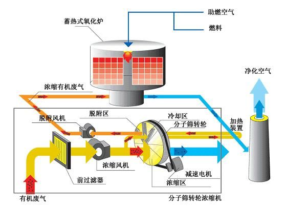 低浓度、高风量的有机废气流过浓缩转轮吸附区时,其中的挥发性有机物会被吸附下来。经过吸附净化后的气体(风量约占总量的90%)排放到空气中去。一小部分气体(风量约占总量的10%)被加热到脱附温度。浓缩转轮持续旋转到脱附区域,在此有机物从吸附剂上脱离到加热的少量气流中,从而转轮得到再生。而高浓度、低风量的浓缩VOCs气体最终被送入焚烧炉TO/RTO处理。再生后的沸石转轮进入冷却区,被冷却到常温后,再进入吸附区。